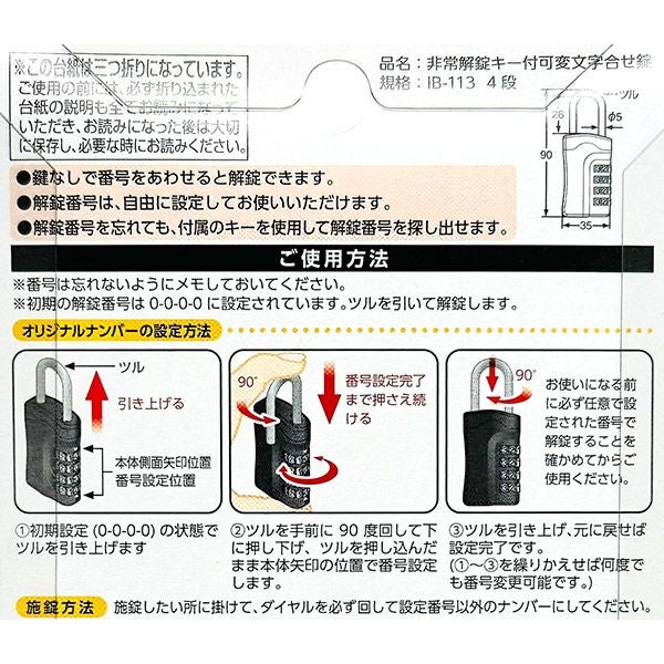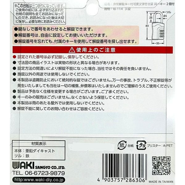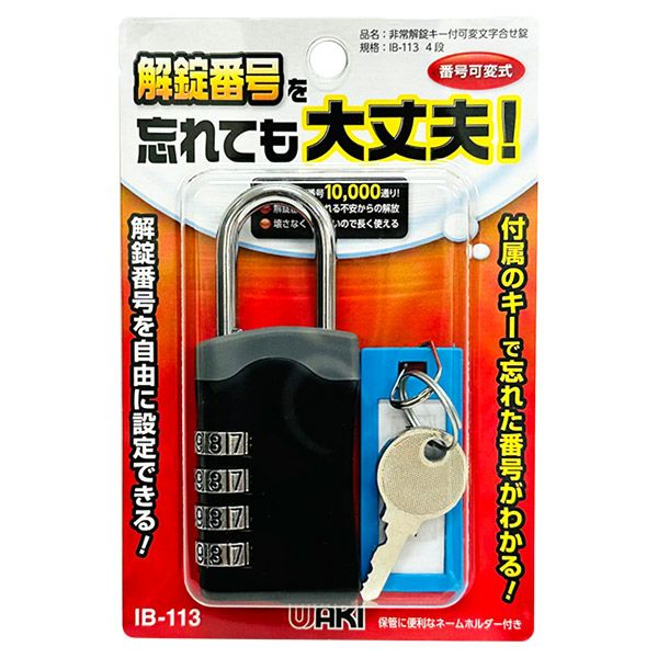 他の画像を見る 解錠番号を忘れても大丈夫!ポストなどに 和気産業 WAKI 非常解錠キー付可変文字合せ錠 IB-113 4段 番号可変式 南京錠 価格 ¥ 1,880 税込 カートに入れる お気に入りに登録する