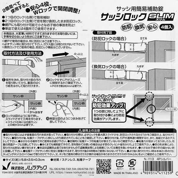 他の画像を見る 2個並べた使用で開閉位置調整! ノムラテック サッシロックスリム 4個入 シルバー N-1113 サッシ用簡易補助錠 防犯対策 価格 ¥ 980 税込 カートに入れる お気に入りに登録する