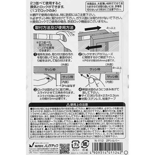 他の画像を見る 2個並べた使用で開閉位置調整! ノムラテック サッシロックスリム 2個入 シルバー N-1112 サッシ用簡易補助錠 防犯対策 価格 ¥ 548 税込 カートに入れる お気に入りに登録する