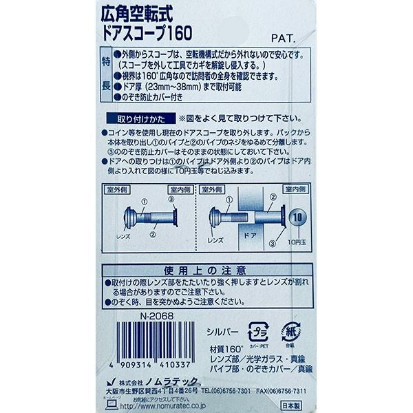 他の画像を見る 今ついているスコープを防犯スコープに取替え ノムラテック 広角空転式ドアスコープ160 シルバー N-2068 広角160度 防犯 価格 ¥ 1,480 税込 カートに入れる お気に入りに登録する
