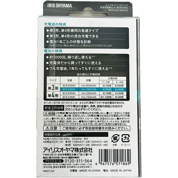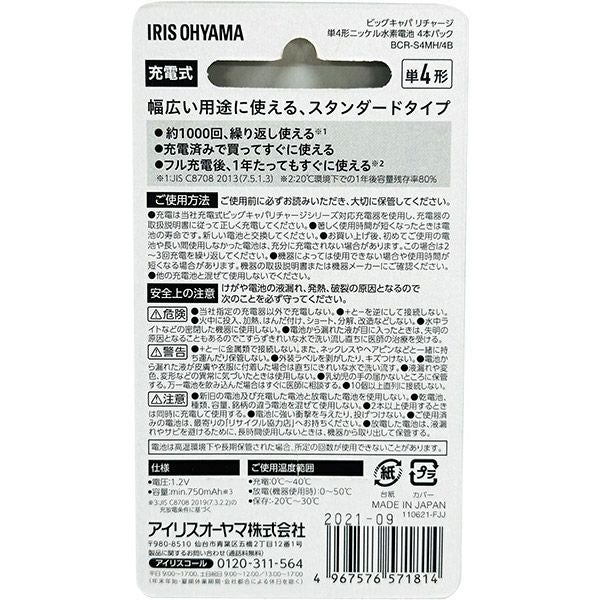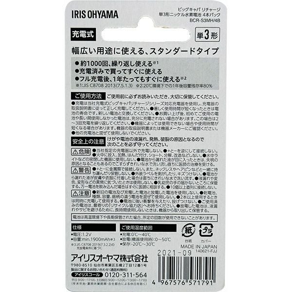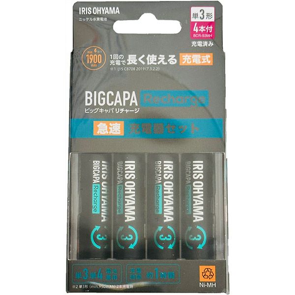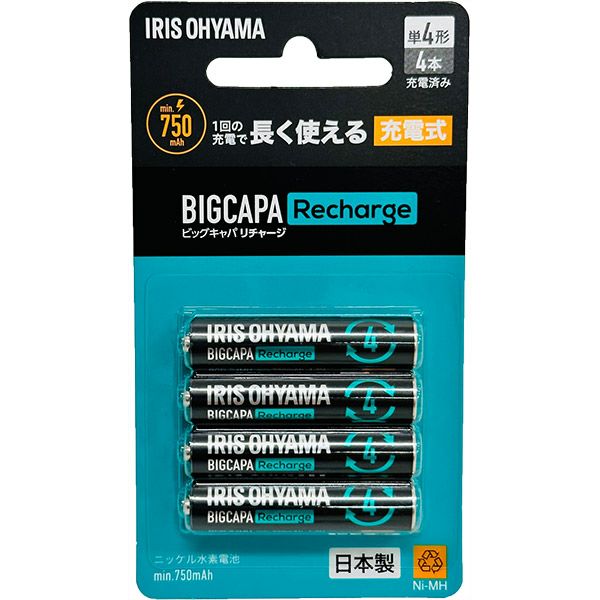 他の画像を見る くり返し充電して使える「日本製」充電池 アイリスオーヤマ ビックキャパ リチャージ 単3形 ニッケル水素電池 4本パック BCR-S3MH/4B 価格 ¥ 1,480 税込 カートに入れる お気に入りに登録する