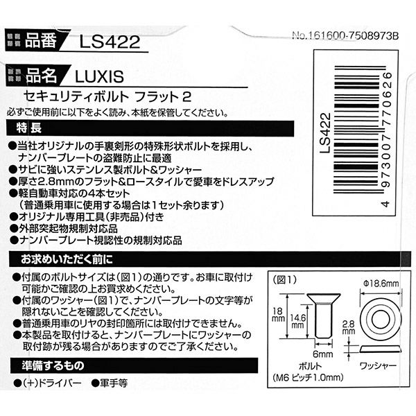 即日出荷 カーメイト セキュリティボルト フラット2 LUXIS LS422 盗難防止ボルト 日本製