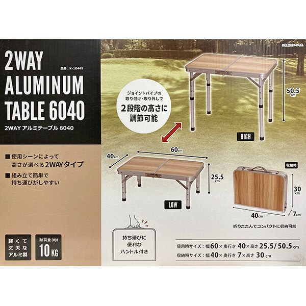 他の画像を見る 2段階の高さに調節可能 即日出荷 ParkLane パークレーン 木目調 2WAYアルミテーブル 6040 K-10449 アウトドアテーブル 折りたたみ 価格 ¥ 2,980 税込 カートに入れる お気に入りに登録する