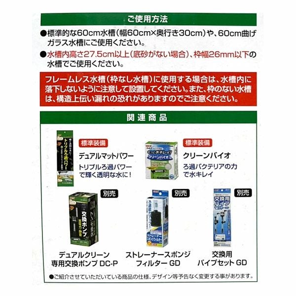 他の画像を見る 2つのろ過槽と高効率な2段階ろ過で水をもっときれいに ジェックス GEX デュアルクリーン600 DC-600 幅60cm水槽用上部式フィルター 価格 ¥ 4,280 税込 カートに入れる お気に入りに登録する