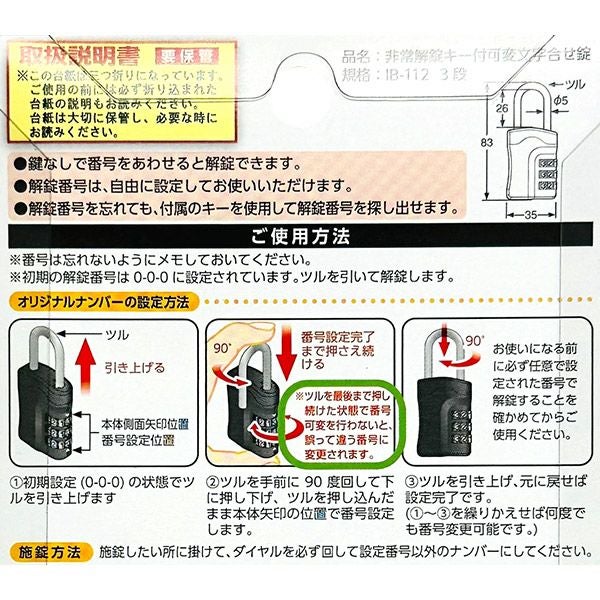 他の画像を見る 解錠番号を忘れても大丈夫!ポストなどに 和気産業 WAKI 非常解錠キー付可変文字合せ錠 IB-112 3段 番号可変式 南京錠 価格 ¥ 1,580 税込 カートに入れる お気に入りに登録する